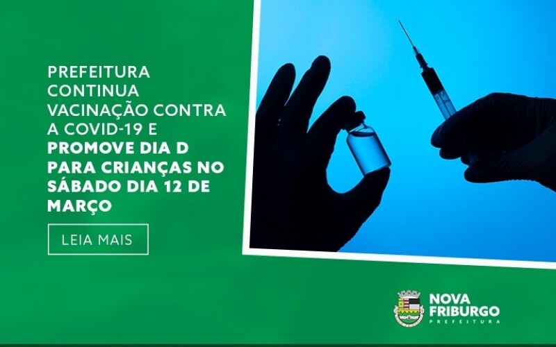 No sábado, dia 12 de março, haverá o Dia D com repescagem para todas as crianças com 5 a 11 anos. Das 9h às 15h, a vacinação será feita no Ginásio Poliesportivo Alberto da Rosa Pinheiro, em Conselheiro Paulino, Posto Dr. Tunney Kassuga, em Olaria, Ginásio Poliesportivo João Antunes Nogueira (Bieca), no Cordoeira, na Universidade Estadual do Rio de Janeiro (Uerj), na Lagoinha, e na UBS/ESF de São Geraldo. Das 9h às 13h, nas Estratégias de Saúde da Família de Mury, Campo do Coelho, Riograndina, Amparo e Lumiar.