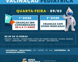 VACINAÇÃO PEDIÁTRICA - A vacinação das crianças continua na próxima semana. Na quarta-feira, 9, a Prefeitura de Nova Friburgo, através da Secretaria Municipal de Saúde, realizará a campanha de primeira e segunda doses para quem está na faixa etária de 6 a 11 anos.