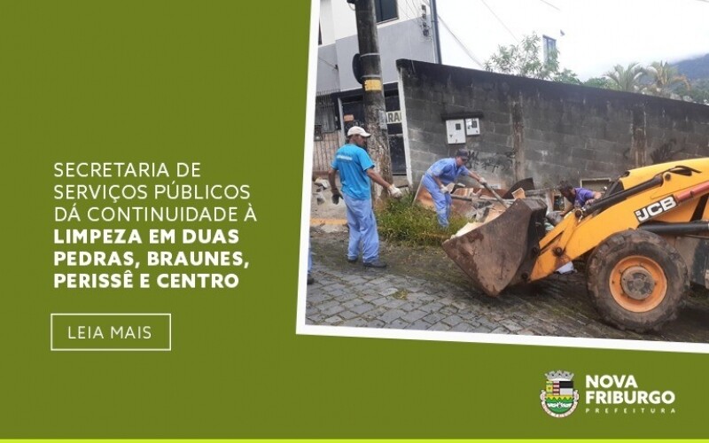 Após as chuvas intensas dos últimos dias, a Secretaria de Serviços Públicos atuou na retirada de lama no Suspiro, nas proximidades do Clube de Xadrez e na Rua Manoel Antônio Ventura; na desobstrução de bueiros na Praça Getúlio Vargas e na lavagem de calçada na Avenida Alberto Braune. O trabalho de limpeza de bueiros também foi executado em vários locais do centro da cidade, incluindo as avenidas Euterpe Friburguense e Alberto Braune.