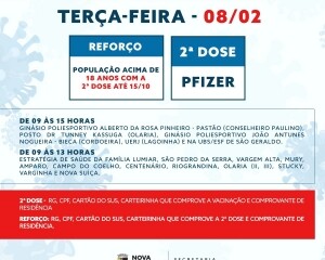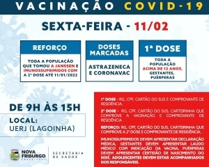 Em relação à segunda dose, na terça-feira haverá a Pfizer e na sexta-feira a Astrazeneca e Coronavac. A repescagem de primeira dose para quem ainda não se imunizou será realizada na sexta-feira, na Universidade Estadual do Rio de Janeiro (Uerj), na Lagoinha.