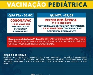 Atenção: na quarta-feira, 02 de fevereiro, a Coronavac será oferecida para esta faixa etária sem comorbidade ou deficiência permanente. Na quinta-feira, 03, além desse grupo, haverá uma repescagem para as crianças de cinco a 11 anos do grupo de risco com a Pfizer pediátrica.
