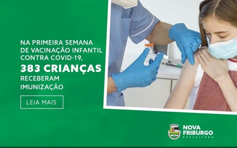 A Prefeitura de Nova Friburgo iniciou na última quarta-feira, 19, a vacinação contra covid-19 em crianças. A vacina foi oferecida para as crianças de 11 anos com comorbidade ou deficiência permanente e 120 doses foram aplicadas. Em paralelo, o município realiza vacinação dentro das instituições que atendem crianças com necessidades especiais e em situação de vulnerabilidade, na faixa etária de 5 a 11 anos. Ao longo dessa semana, outras 263 crianças também foram vacinadas. Ao final desta primeira semana de imunização infantil a cidade já soma 383 crianças com a primeira dose.