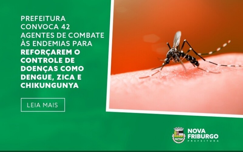 A Prefeitura de Nova Friburgo publicou no Diário Oficial Eletrônico do Município da última terça-feira, 18 de janeiro, a convocação de 42 agentes de combate às endemias (ACE) para reforçarem os quadros da Subsecretaria de Vigilância em Saúde, vinculada à Secretaria Municipal de Saúde.