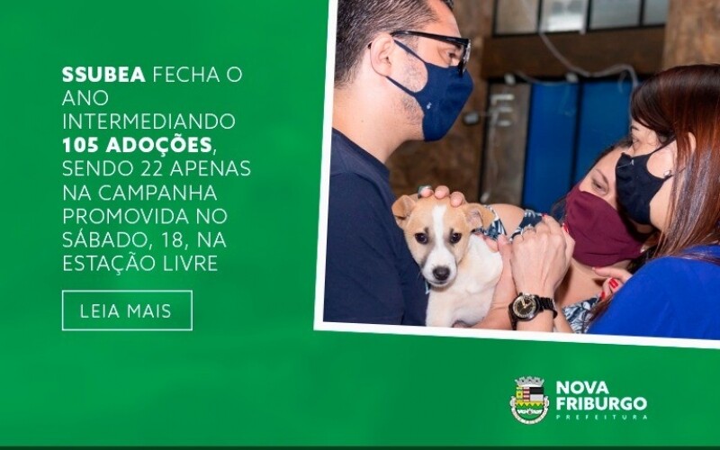 Mais 22 animais (entre cães e gatos) ganharam uma nova família e um novo lar durante a Campanha de Adoção Responsável promovida pela Prefeitura de Nova Friburgo, através da Subsecretaria Municipal do Bem-Estar Animal (Ssubea), no último sábado, 18 de dezembro, na Estação Livre, no Centro. A ação é uma parceria entre a Ssubea e os abrigos e grupos de proteção animal de Nova Friburgo.