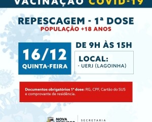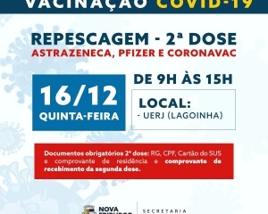 Na quinta-feira, 16 de dezembro, na Universidade Estadual do Rio de Janeiro, a UERJ, haverá repescagem da primeira dose para maiores de 18 anos e de segunda dose, com os imunizantes da Pfizer, Coronavac e Astrazeneca disponíveis para quem ainda não recebeu a vacina.