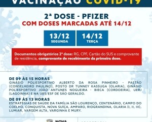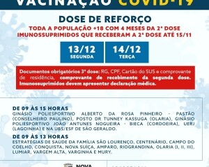 Na segunda e terça-feira, 13 e 14 de dezembro, as campanhas de reforço, de vacinação de segunda dose da Pfizer e de primeira dose para gestantes, puérperas e adolescentes acontecem em todas as unidades de saúde.