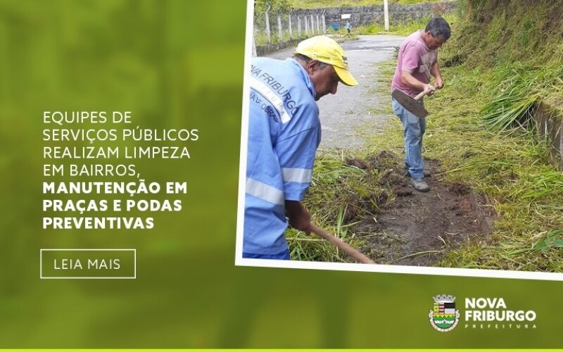A Prefeitura de Nova Friburgo, através da Secretaria de Serviços Públicos, realizou ações de poda em árvores, manutenção em praças e deu andamento no trabalho de capina, limpeza e retirada de lixo de alguns bairros, como Perissê, Cordoeira, Duas Pedras, Lazareto e Braunes. Outro trabalho de destaque dos últimos dias foi o plantio de hortênsias em canteiros e nas divisórias de pistas do bairro Ypu.