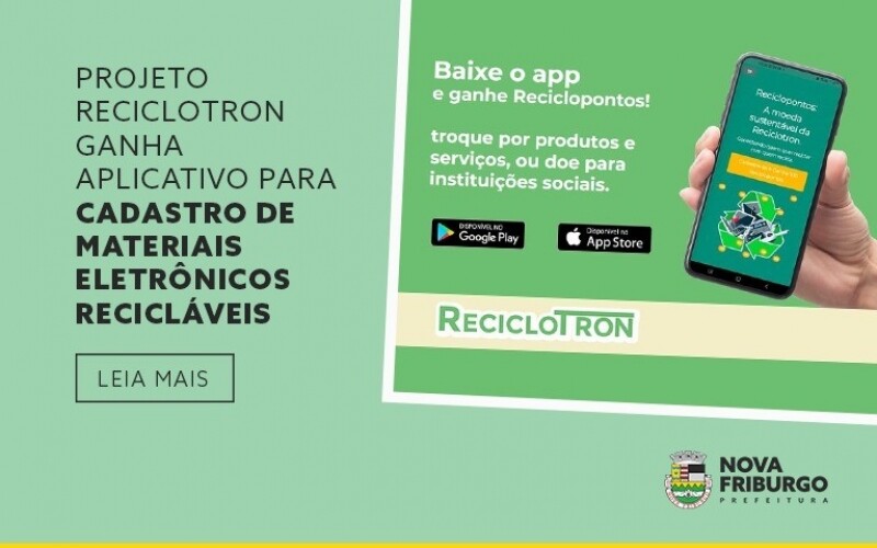 A Secretaria Municipal de Ciência e Tecnologia, parceira do Reciclotron da Universidade Federal Fluminense (UFF), informa que agora o projeto conta com um aplicativo para cadastrar o material descartado e trocar por pontos que podem ser utilizados em diversos lugares da cidade. E a Central de Operações e Monitoramento - Nova Friburgo Cidade Inteligente - tem um ponto de coleta, onde o cidadão interessado em participar do projeto pode conectar o seu aparelho no wi-fi livre disponibilizado pela central, baixar o app, fazer o cadastro e já receber os pontos direto no app.