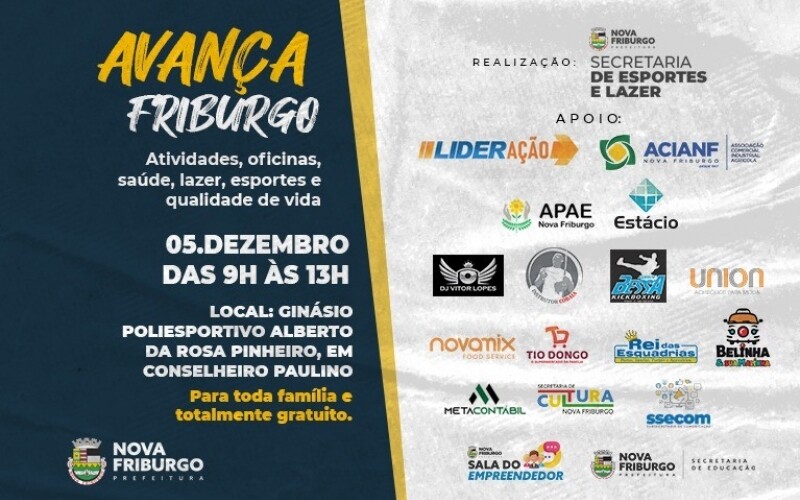 O “Avança Friburgo” conta com o apoio da Estácio Friburgo, Teia de Eventos, Nova Mix, Pão da Praça, Tio Dongo, Union, Rei das Esquadrias, Meta Contabilidade, APAE, ACIANF e SEBRAE.