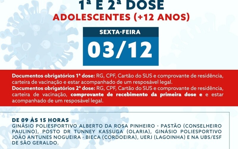 Na próxima sexta-feira, 3 de dezembro, os adolescentes com mais de 12 anos poderão receber a primeira dose da vacina contra a Covid-19, através da repescagem. Além disso, os jovens que estiverem com a segunda aplicação marcada até o dia 7 de dezembro também poderão receber o imunizante até esta sexta-feira.