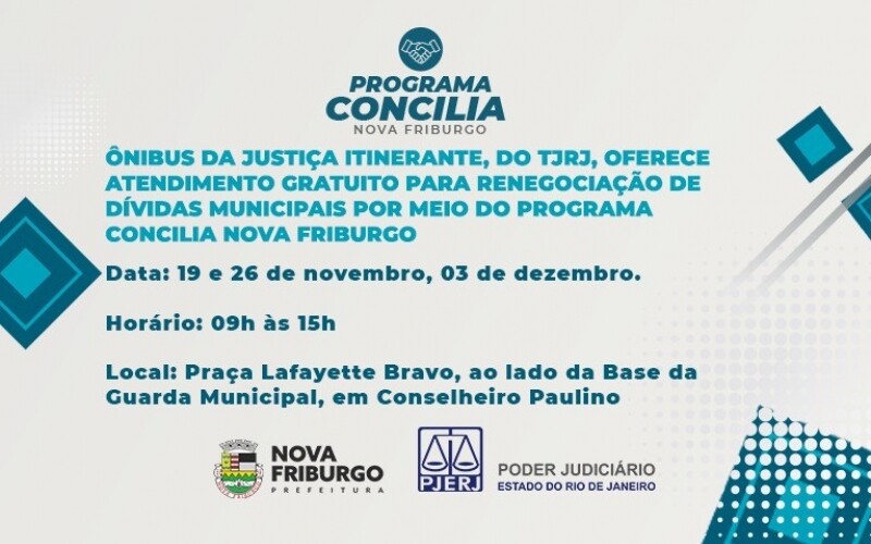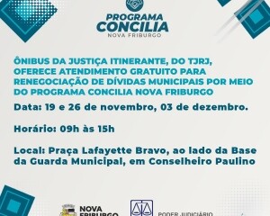 O Programa Concilia Nova Friburgo está em vigor e oferece condições especiais para contribuintes quitarem débitos municipais. A iniciativa é uma parceria da Prefeitura de Nova Friburgo e Tribunal de Justiça do Estado do Rio de Janeiro. Para ajudar no acesso ao programa, o ônibus da Justiça Itinerante estará realizando atendimento gratuito, exclusivamente para o Concilia, nas próximas três sextas-feiras, dias 19 e 26 de novembro e 03 de dezembro, na Praça Lafayette Bravo, ao lado da Base da Guarda Municipal, em Conselheiro Paulino, das 9h às 15h.
