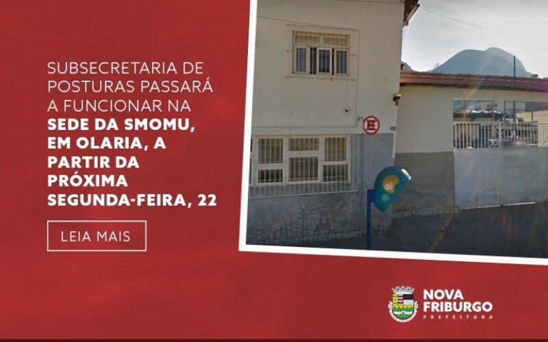 A Prefeitura de Nova Friburgo informa que a Subsecretaria Municipal de Posturas, vinculada à Secretaria Municipal de Ordem e Mobilidade Urbana (Smomu), está mudando de endereço. O setor sai da antiga Rodoviária Leopoldina, no Centro, e passará a funcionar a partir de segunda-feira, 22 de novembro, na sede da Smomu, na Rua Vicente Sobrinho, nº 80, em Olaria.