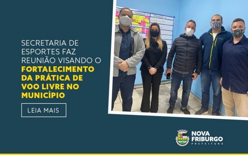 Na última quarta-feira, dia 20, a Secretaria Municipal de Esportes e Lazer realizou uma reunião para tratar da estruturação e fortalecimento da prática de voo livre em Nova Friburgo. A reunião contou com a participação do secretário municipal de Esportes e Lazer, João Victor Duarte, do coordenador da pasta, Thayan Carestiato, dos pilotos de voo livre Flávio Dias e Pedro Martins, e de Dayviane Garcia, representando a deputada estadual Adriana Balthazar e o deputado federal Paulo Ganime.