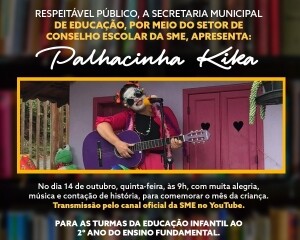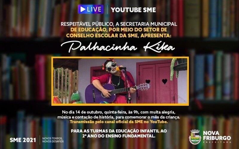 No próximo dia 12, terça-feira, comemora-se o Dia das Crianças e, para celebrar a data com muita alegria, a Prefeitura de Nova Friburgo, por meio do setor de Conselho Escolar da Secretaria Municipal de Educação (SME), realizará, às 9h, do dia 14, quinta-feira, uma live com a participação da Palhacinha Kika. Teremos contação de história e música! A transmissão será pelo canal oficial da SME no YouTube. O público alvo do evento on-line é a criançada da Educação Infantil até o 2º ano do Ensino Fundamental.