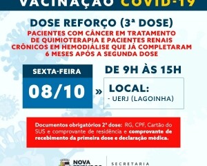 A Secretaria Municipal de Saúde de Nova Friburgo realizará a aplicação da terceira dose (reforço) em pacientes portadores de câncer em tratamento de quimioterapia, HIV/Aids e pacientes renais crônicos em hemodiálise, na próxima sexta-feira, dia 8.