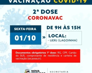 Na sexta-feira, 1° de outubro, a aplicação da segunda dose da Coronavac das vacinas aprazadas será realizada das 9h às 15h, na Universidade Estadual do Rio de Janeiro (Uerj), no bairro Lagoinha.