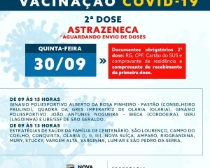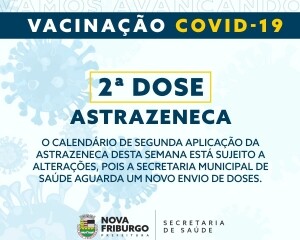 É importante ressaltar que a vacinação de segunda dose da Astrazeneca está sujeita a alterações nessa semana, pois a Secretaria Municipal de Saúde está aguardando um novo envio de doses deste laboratório. Caso não haja o repasse até a quarta-feira, a imunização desse dia e da quinta-feira poderá ser suspensa.