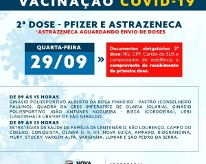 Na quarta, 29, acontecerá a vacinação de segunda dose dos imunizantes da Pfizer e da Astrazeneca para quem está com as datas aprazadas, ou seja, marcadas até a presente data. Enquanto na quinta, 30, a previsão é que sejam vacinados, também com a Astrazeneca, as pessoas com a vacina marcada até o dia 30.