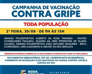 A Prefeitura de Nova Friburgo realizará na próxima segunda-feira, 30 de agosto, a vacinação contra a influenza em cinco unidades de saúde. A ação tem como objetivo ampliar o número de vacinados contra a gripe no município. A imunização é de extrema importância para prevenir formas mais graves dessas doenças infecciosas, principalmente em um momento pandêmico.