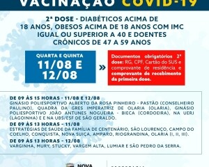 Na quarta e quinta, 11 e 12, a Prefeitura também retoma a vacinação de segunda dose. Obesos acima de 18 anos e doentes crônicos com 54 a 59 anos poderão ir até as unidades.