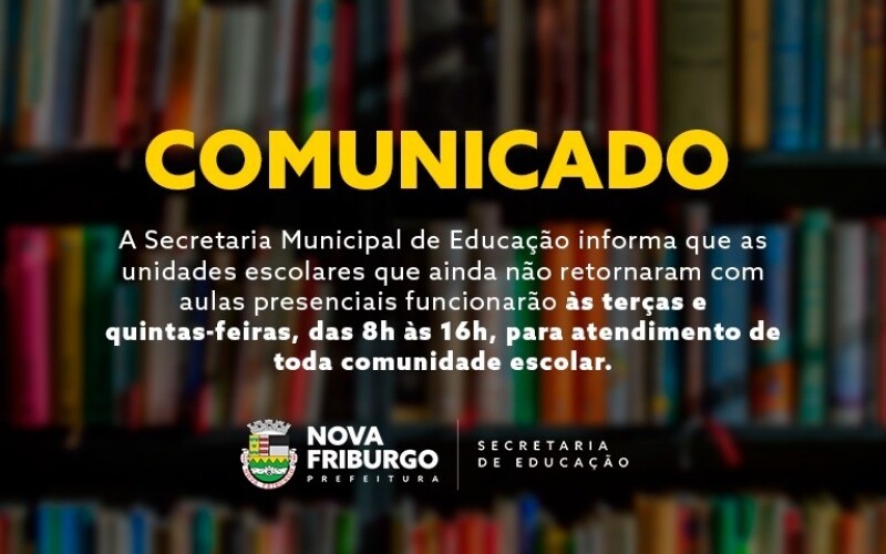 As unidades escolares do município que ainda não retornaram com as aulas presenciais terão plantões fixos às terças e quintas-feiras, das 8h às 16h, de acordo com a Secretaria Municipal de Educação, da Prefeitura de Nova Friburgo. Este esquema de trabalho começa a partir de amanhã, 03, e, vale destacar que, os protocolos sanitários de combate à covid-19 serão respeitados.