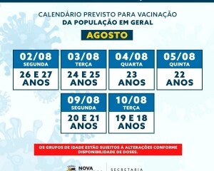 A Secretaria pretende começar o mês de agosto vacinando a população com 27 e 26 anos, e assim, no dia 10, finalizar a vacinação de primeira dose em todos os friburguenses com mais de 18 anos.