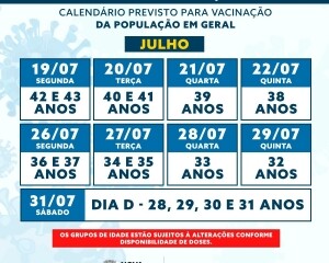 Na próxima semana, a imunização de primeira dose irá avançar de 43 até os 38 anos. Já até o final do mês de julho, a previsão é que toda a população com até 28 anos esteja recebendo a primeira aplicação da vacina.