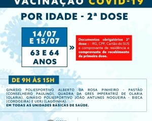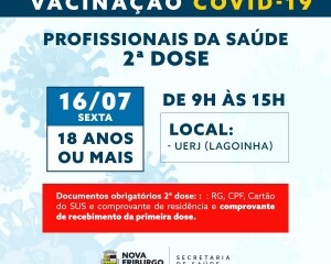 Também na quarta e quinta-feira, a Secretaria Municipal de Saúde realiza a imunização de segunda dose de idosos com 64 e 63 anos nas Unidades Básicas de Saúde: no Ginásio poliesportivo Alberto da Rosa Pinheiro, o Pastão (Conselheiro Paulino), na Quadra da GRES Imperatriz de Olaria (Olaria), no Ginásio poliesportivo João Antunes Nogueira, Bieca (Cordoeira), na Universidade Estadual do Rio de Janeiro, a UERJ (Lagoinha).