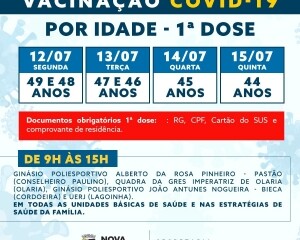 Na quarta-feira, 14, também em todas as UBS e nas ESFs, recebem a primeira dose quem tiver 45 anos. Já na quinta-feira, 15, a idade contemplada é 44 anos, nos mesmos pontos de vacinação.