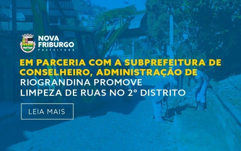 O administrador de Riograndina, Ricardo Preto, agradece a parceria da Subprefeitura de Conselheiro Paulino, através da subprefeita Patricia Felippe de Souza. "Ela nos atendeu estendendo esse braço de apoio muito importante para a continuidade dos trabalhos no segundo distrito. Aproveitamos a oportunidade para solicitar à população para que não descarte lixo ou entulhos nas vias públicas”, frisou Ricardo.