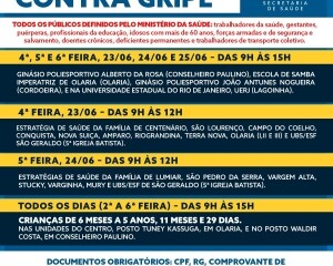 Ainda na quarta-feira, 23, das 9h às 12h, a dose contra influenza será distribuída nas Estratégias de Saúde da Família de Centenário, São Lourenço, Campo do Coelho, Conquista, Nova Suíça, Amparo, Riograndina, Terra Nova, Olaria (I, II e III) e na UBS/ESF de São Geraldo (5ª Igreja Batista).