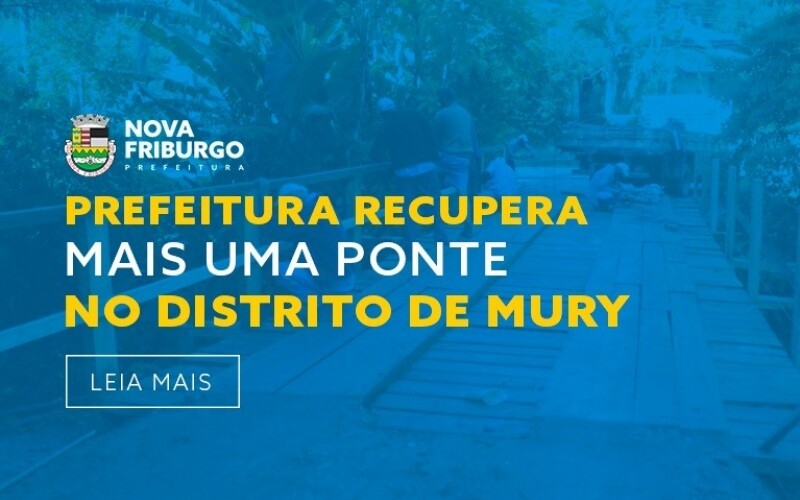 A Prefeitura de Nova Friburgo recuperou mais uma ponte no distrito de Mury. Desta vez a Secretaria de Obras fez a intervenção próxima ao Hotel Garlipp, em um dos acessos para Macaé de Cima. Foram colocados três novos troncos de madeira para reforçar a estrutura já existente da ponte, que mede 13 metros de comprimento por 3 metros e meio de largura.