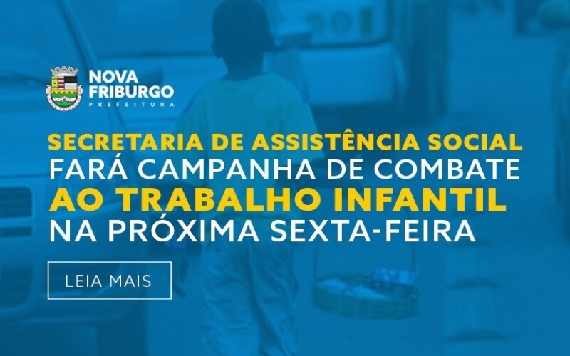 O dia 12 de junho marca mundialmente o combate ao trabalho infantil. E para conscientizar a população sobre este assunto, a Secretaria Municipal de Assistência Social, Direitos Humanos, Trabalho e Políticas Públicas para a Juventude estará com algumas equipes nas ruas de Nova Friburgo na próxima sexta-feira, dia 11, fazendo a entrega de panfletos com esclarecimento da sociedade sobre os malefícios do trabalho infantil.