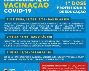Dando prosseguimento ao Plano Nacional de Imunização, do Ministério da Saúde, a cidade vai imunizar profissionais da Educação das redes municipal, estadual e privada, incluindo professores e profissionais de apoio. Este grupo é formado por funcionários da Educação Infantil, Ensino Básico, Ensino Fundamental, Médio, Profissionalizante, Educação de Jovens e Adultos e Ensino Superior. A vacinação acontece na próxima segunda e terça-feira, dias 14 e 15 de junho, das 9h às 15h, no Ginásio Poliesportivo Alberto da Rosa Pinheiro – Pastão (Conselheiro Paulino), Quadra da GRES Imperatriz de Olaria (Olaria), Ginásio Poliesportivo João Antunes Nogueira – Bieca (Cordoeira) e na Universidade Estadual do Rio de Janeiro (UERJ), no bairro Lagoinha.