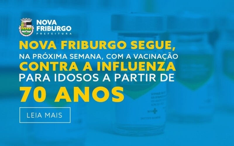A Prefeitura de Nova Friburgo, através da Secretaria Municipal de Saúde, informa que a vacinação contra a Influenza em Nova Friburgo segue na próxima semana, nos dias 9 e 10 de junho. Desta vez a imunização será voltada para idosos, a partir de 70 anos. A apresentação da caderneta de vacinação é obrigatória, especialmente para as pessoas que já tomaram uma ou as duas doses da vacina contra a Covid-19. É necessário um intervalo mínimo de 15 dias entre as vacinas de Covid e de Influenza.