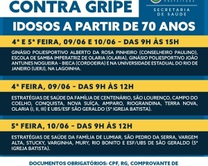No dia 09, 9h às 12h, a vacinação acontece ainda nas Estratégias de Saúde da Família de Centenário, São Lourenço, Campo do Coelho, Conquista, Nova Suíça, Amparo, Riograndina, Terra Nova, Olaria (I, II, III) e UBS/ESF São Geraldo (5ª Igreja Batista). Enquanto no dia 10, também das 9h às 12h, será oferecida nas Estratégias de Saúde da Família de Lumiar, São Pedro da Serra, Vargem Alta, Stucky, Varginha, Mury, Rio Bonito e ESF/UBS de São Geraldo (5ª Igreja Batista).