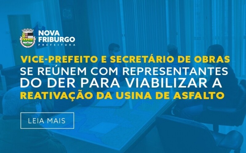 O vice-prefeito de Nova Friburgo, Serginho, e o secretário Municipal de Obras, Bernardo Verly, estiveram nesta segunda-feira, 31 de maio, no Rio de Janeiro, para uma importante reunião com representantes do Departamento de Estradas de Rodagem do Estado do Rio de Janeiro (DER-RJ), visando a reativação da Usina de Asfalto, localizada na Chácara do Paraíso, que está há anos desativada no município.