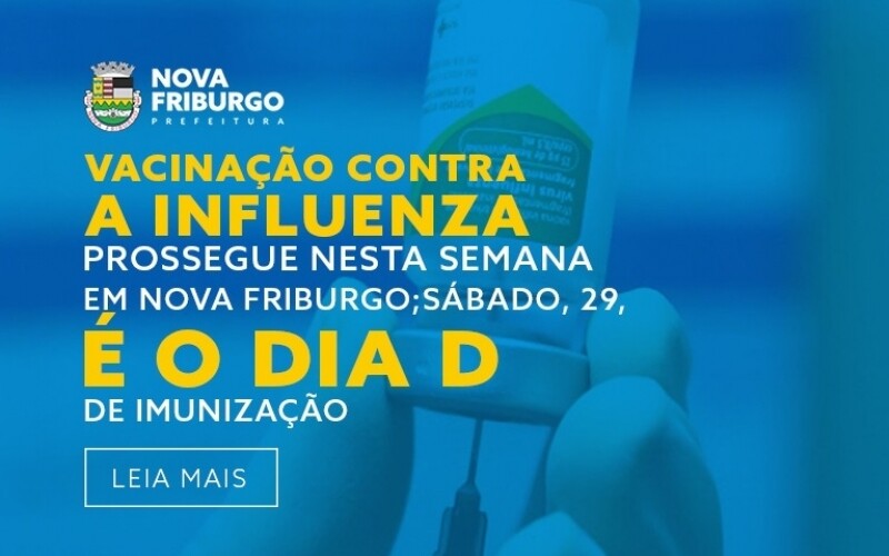 A Prefeitura de Nova Friburgo, por meio da Subsecretaria Municipal de Vigilância em Saúde, vinculada à Secretaria Municipal de Saúde, relembra que a imunização contra o vírus Influenza segue nesta semana em diversos pontos de vacinação no município, com Dia D no próximo sábado, 29 de maio. É importante lembrar que todos devem ter em mãos a caderneta de vacinação (caso tenha), especialmente se já tomou uma ou as duas doses da vacina contra a Covis-19.