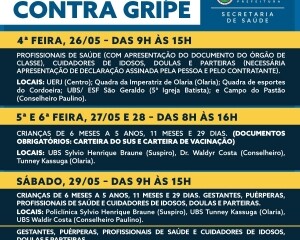 Nesta quarta-feira, 26 de maio, foram imunizados profissionais de saúde, cuidadores de idosos, doulas e parteiras. Já na quinta e na sexta-feira (27 e 28 de maio) a imunização será para crianças de 6 meses a 5 anos, 11 meses e 29 dias, das 8h às 16h, somente nas UBS Sylvio Henrique Braune (Suspiro), Dr. Waldyr Costa (Conselheiro), Tunney Kassuga (Olaria).