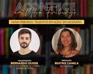 Para fechar com muito brilho as lives com participantes de Nova Friburgo, na quinta-feira, dia 27, às 14h, o bate-papo será com o ator, professor de teatro e apresentador Bernardo Dugin, um dos diretores do documentário Terra Nova, condomínio construído após o evento climático de 2011. Para a conversa com o tema "Nova Friburgo: talentos em ação/em ascensão", a professora Beatriz Canela mediará o encontro virtual.