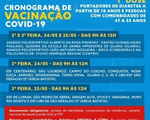 Na segunda-feira, 24 de maio, a imunização será feita nas ESF Centenário, São Lourenço, Campo do Coelho, Conquista, Nova Suíça, Amparo, Riograndina, Terra Nova, Olaria (I, II, III) e UBS/ESF São Geraldo (5ª Igreja Batista). Já na terça-feira, dia 25 de maio, das 9h às 12h, será nas ESF de Lumiar, São Pedro da Serra, Vargem Alta, Stucky, Varginha, Mury, Rio Bonito e ESF/UBS de São Geraldo (5ª Igreja Batista).