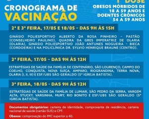 Na segunda-feira, dia 17, a primeira dose também estará disponível das 9h às 12h, nas Estratégias de Saúde da Família de Centenário, São Lourenço, Campo do Coelho, Conquista, Nova Suíça, Amparo, Riograndina, Terra Nova e Olaria (I, II, III). Já na terça-feira, dia 18, das 9h às 12h, será nas ESF de Lumiar, São Pedro da Serra, Vargem Alta, Stucky, Varginha, Mury e Rio Bonito. Em ambos os dias (17 e 18/05), a ESF/ UBS de São Geraldo (5ª Igreja Batista) também oferecerá a vacina, das 9h às 12h.