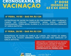 Na quarta-feira, dia 19, as seguintes Estratégias de Saúde da Família farão a aplicação da vacina: Centenário, São Lourenço, Campo do Coelho, Conquista, Nova Suíça, Amparo, Riograndina, Terra Nova e Olaria (I, II, III). Na quinta-feira, dia 20, será a vez das ESF de Lumiar, São Pedro da Serra, Vargem Alta, Stucky, Varginha e Mury. Nos dias 19 e 20, haverá ainda vacinação na ESF/ UBS São Geraldo (5ª Igreja Batista), das 9h às 12h.