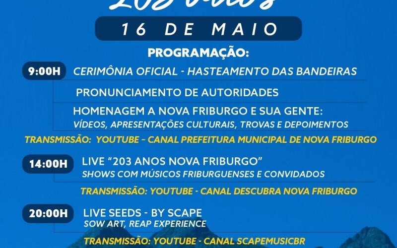 O programa tem sequência à tarde. Às 14h será transmitida pelo YouTube, no canal Descubra Nova Friburgo, a live com o tema “203 anos de Nova Friburgo”’, contando com shows de músicos friburguenses e convidados. À noite o programa será encerrado às 20h, com outra live, Seeds – by Scape, com sow art e reap experience, cuja transmissão será pelo YouTube, canal Scapemusicbr.