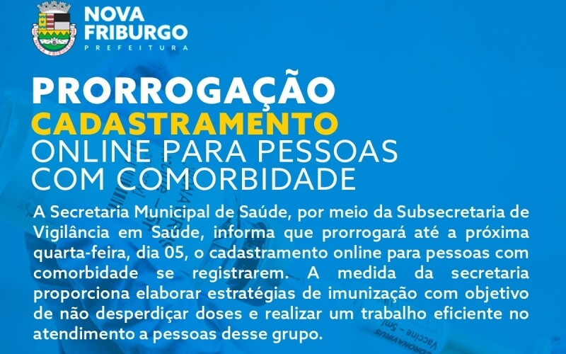A Secretaria Municipal de Saúde, por meio da Subsecretaria de Vigilância em Saúde, informa que prorrogará até a próxima quarta-feira, dia 5, o cadastramento online para pessoas com comorbidade se registrarem para serem vacinadas contra a covid-19. Embora ainda não haja data definida para início da imunização desse público-alvo, a medida da secretaria tem por objetivo elaborar estratégias para não desperdiçar doses e realizar um trabalho eficiente no atendimento às pessoas desse grupo.