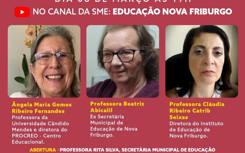 A abertura será feita pela secretária municipal de Educação, professora Rita Silva. Na sequencia, haverá apresentação da professora Maiara Inimá e a mediação ficará por conta da professora Juliana Piran, além da participação de três personalidades femininas importantes: Ângela Maria Gomes Ribeiro Fernandes, professora da Cândido Mendes e diretora do Centro Educacional (PROCREO); Beatriz Abicalil, ex-secretária de Educação do município; e Cláudia Ribeiro Catrib Seixas, diretora do Instituto de Educação de Nova Friburgo (IENF).
