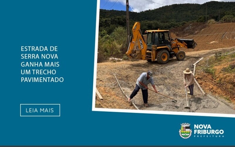 A Prefeitura de Nova Friburgo, por meio da Secretaria de Agricultura e Desenvolvimento Rural e da Secretaria Executiva de Desenvolvimento Regional, executa a pavimentação em concreto de mais 350 metros – de mais de dois quilômetros já pavimentados – na estrada de acesso à Serra Nova, no distrito de Campo do Coelho, em parceria com a Associação dos Produtores Rurais local. O serviço, que está sendo acompanhado pelo secretário Adelso Rapozo e pelo subprefeito de Campo do Coelho, Fernando Samuel de Lima, também conta com o apoio da subprefeitura de Lumiar e São Pedro da Serra.