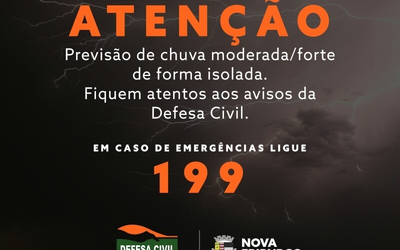 A cidade recebeu alerta de chuvas fortes a moderadas na tarde desta segunda-feira, 22, mas Evi reforça que as equipes da Defesa Civil estão em alerta para qualquer chamado da população e caso seja necessário, devem ligar para o telefone 199.