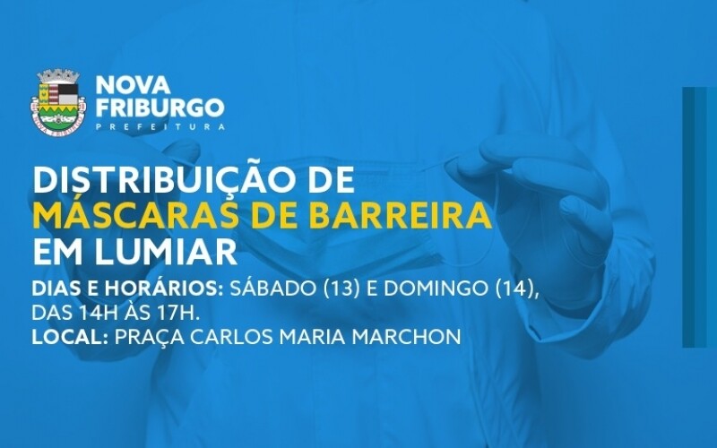 Apesar da suspensão do Carnaval deste ano, os trabalhos das secretarias pertencentes à Prefeitura de Nova Friburgo não cessarão. Neste próximo sábado, 13, e domingo, 14, a Secretaria de Turismo, com o apoio da Secretaria de Esporte e da ACIANF, estará em Lumiar, das 14h às 17h, para distribuir máscaras de barreira na Praça Carlos Maria Marchon.