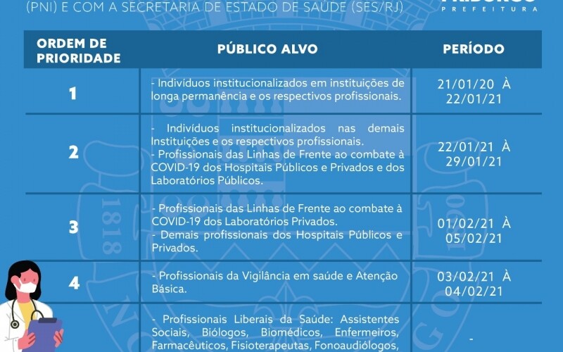 Os critérios adotados pelo município para execução da estratégia de vacinação seguirão as normas e determinações estabelecidas pelo Programa Nacional de Imunização (PNI) do Ministério da Saúde e da Secretaria de Estado de Saúde, inclusive os públicos-alvo para cada etapa e o cronograma. Ainda de acordo com a Secretaria Municipal, a execução do referido cronograma está sujeito a alterações conforme orientações do Ministério e da Secretaria de Estado, e de acordo com o abastecimento de imunobiológicos nas quantidades necessárias. A execução dos períodos de vacinação depende do abastecimento de novas doses da vacina pelo Ministério da Saúde.